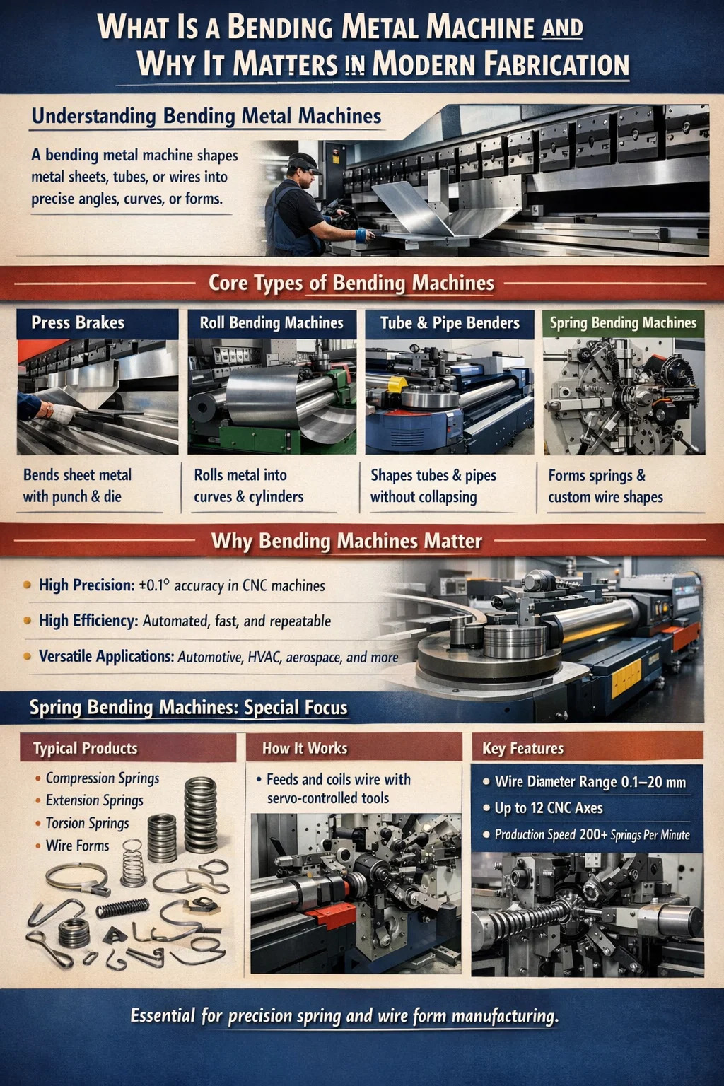 دستگاه خم کن فنری زیرمجموعه ای تخصصی از خانواده دستگاه های خم کن گسترده تر است. در حالی که یک پرس ترمز عمومی بر روی ورق فلز تمرکز می کند، a دستگاه خم کن فنری به طور خاص برای باد، سیم پیچ، و شکل دادن استوک سیم یا میله به فنرهای فشاری، فنرهای کششی، فنرهای پیچشی و سیم های سفارشی طراحی شده است. این دو نوع ماشین اغلب در یک مرکز وجود دارند - و درک اینکه چگونه آنها مکمل یکدیگر هستند برای هر منبع تولید تجهیزات مدیر ساخت ضروری است.