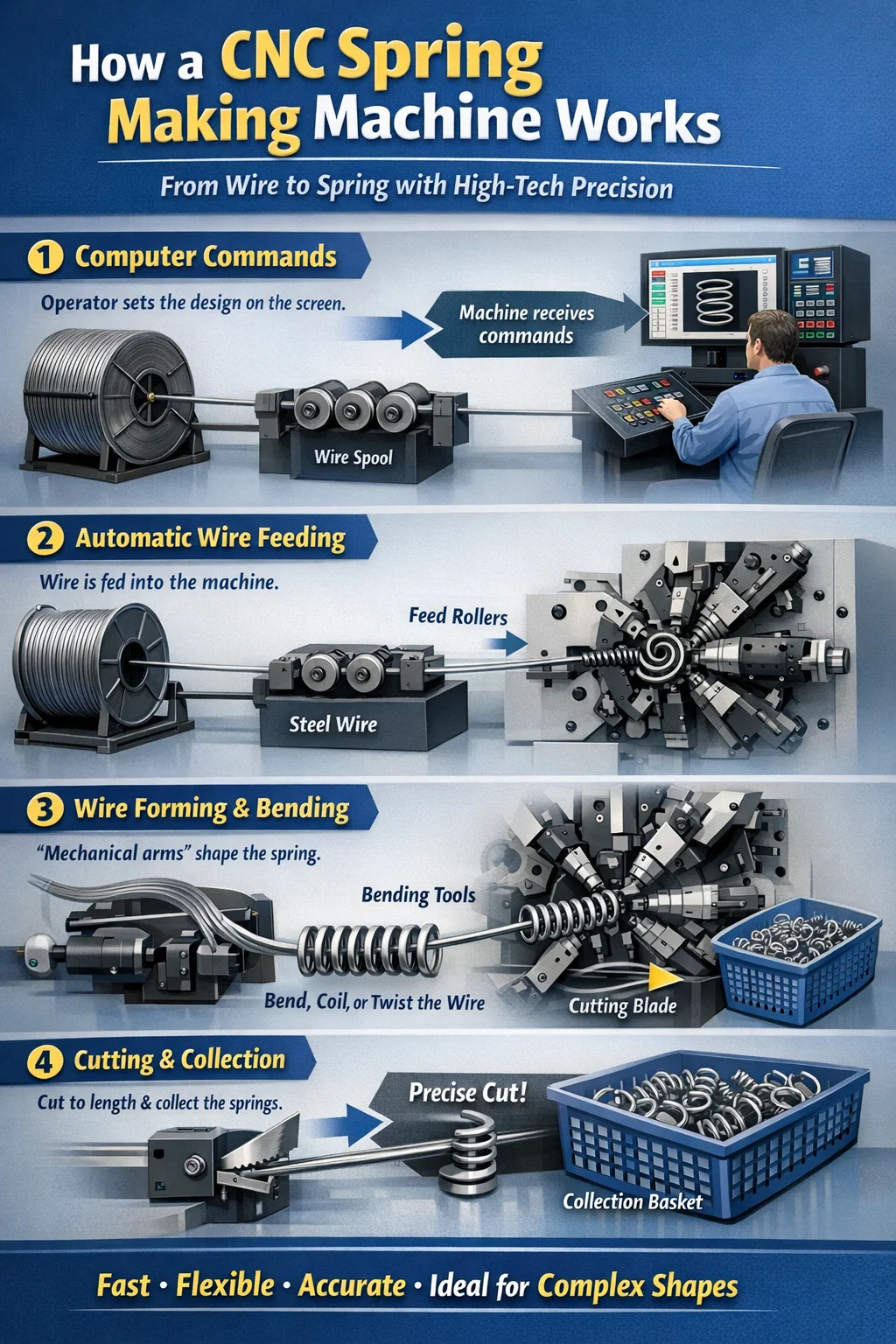 • دستورات «مغز» رایانه: این هسته دستگاه است. اپراتور اندازه، تعداد چرخش، طول و شکل فنر را روی صفحه کامپیوتر تنظیم می کند. رایانه این اطلاعات را به دستورات تبدیل می کند و دقیقاً کنترل می کند که هر موتور (معمولاً موتورهای سروو) در داخل دستگاه چه زمانی و چقدر حرکت می کند.