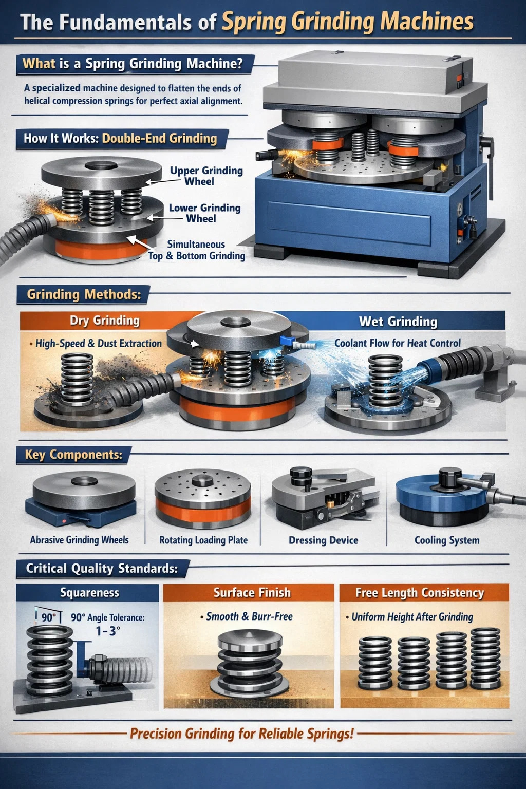الف دستگاه آسیاب فنری یک ابزار ساینده صنعتی تخصصی است که به طور خاص برای صاف کردن انتهای فنرهای فشاری مارپیچ طراحی شده است. در دنیای تولید، فنرهایی که از دستگاه سیم پیچ خارج می شوند، اغلب دارای انتهای "باز" یا ناهموار هستند. بدون سنگ زنی، این فنرها نمی توانند کاملاً عمودی بایستند یا در هنگام فشرده شدن وزن را به طور یکنواخت توزیع کنند. این دستگاه آسیاب فنری مواد اضافی را از سیم پیچ های بالا و پایین برای ایجاد یک سطح صاف و عمود بر می کند.