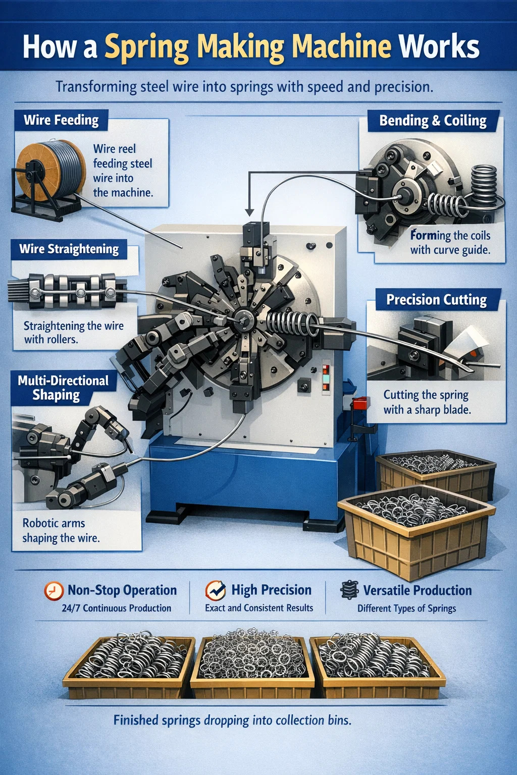 برای تبدیل یک سیم فولادی مستقیم به یک فنر انعطاف پذیر، دستگاه معمولاً مراحل زیر را طی می کند: