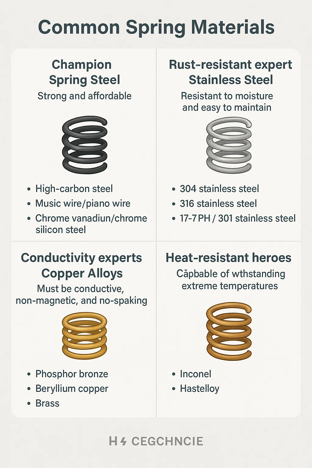 انتخاب فلز مناسب برای فنرها به الزامات کاربرد بستگی دارد - چقدر نیرو تحمل می کند؟ زنگ خواهد زد؟ آیا محیط کار گرم خواهد بود؟ آیا نیاز به رسانایی برق دارد؟ در اینجا ویژگی های مواد متداول استفاده می شود: